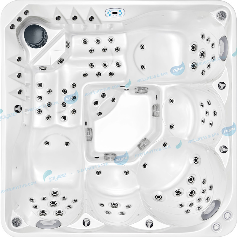 Размеры бассейна около 210×210 см позволяют комфортно разместить до 5 человек, включая лежачие и сидячие места.